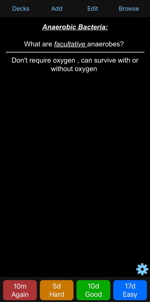 -⏰Convenience, or Ease of studying. I can go through an entire topic in biology anytime, anywhere, in just 10-15 minutes by going through the flashcards in my phone. Moreover, by continuing to set aside 25-30 minutes to do Anki everyday, you’re always staying on top of the game and working on cards you’re struggling with. While sometimes this may not seem very true, as I have definitely still experienced a few brain farts in tests, I can still confidently say I know most of what I made into Anki flashcards.